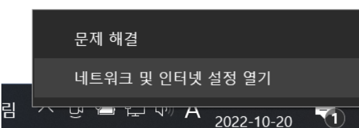 작업 표시줄 오른쪽의 **네트워크 아이콘(이더넷/와이파이)**을 마우스 우클릭합니다.