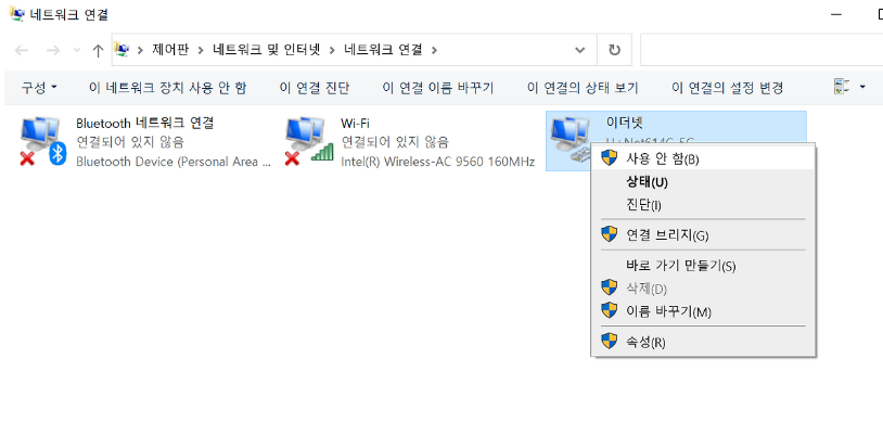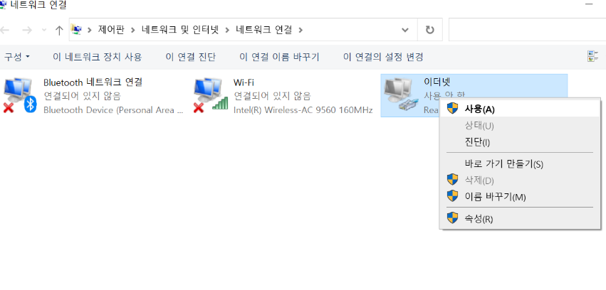네트워크 연결 창에서 "이더넷" 또는 **"Wi-Fi"**를 마우스 우클릭합니다.